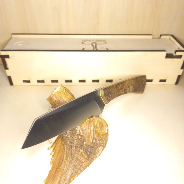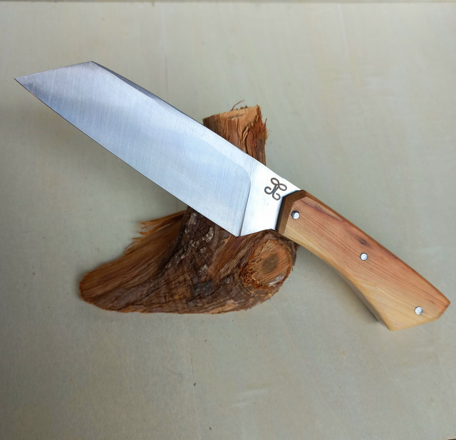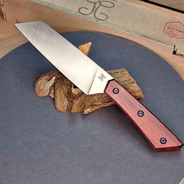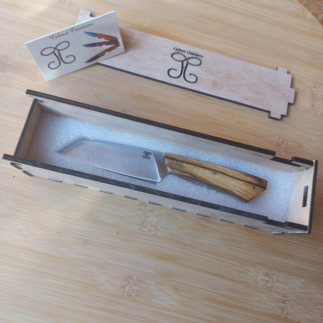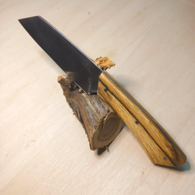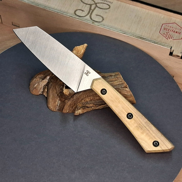 La ligne noire du bois suit le prolongement de l'émouture et relie l'angle haut de la pointe de la lame avec l'angle bas du talon.
